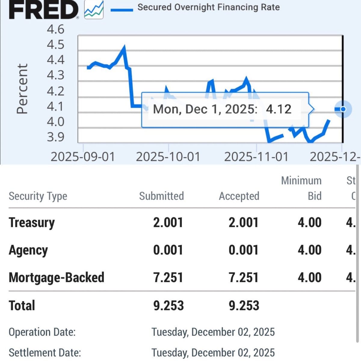 ANALISTA Igor Pereira Posted December 2, 2025 ANALISTA Report Share Posted December 2, 2025 What we were afraid of is happening. Wall Street's short-term funding data just sent out a distress signal. Liquidity is evaporating, the cost of money is shooting above the Fed's targets, and the banks are rushing to the emergency lines. By Igor Pereira, Financial Market Analyst, Junior Member WallStreet NYSEThat's not a technical fluctuation. It is the beginning of a systemic liquidity event. 1. The Race to the SRF: $84 Billions in 7 DaysA Standing Repo Facility (SRF) It's the Fed's lifeline to primary banks that desperately need cash. Today's Data: The use of SRF has reached $9 billion in a single day. The Accumulated: In just 7 days, the total jumped to $84 billion. My Analysis (Igor Pereira): Healthy banks don't use SRF unless they can't get funding in the private market. A peak of this magnitude indicates that banks are hoarding cash and refusing to lend each other. Interbank trust is evaporating. 2. The SOFR Alarm Signal: Fed lost control?A Secured Overnight Finance Rate (SOFR), the rate that replaced LIBOR, is behaving alarmingly. The Shooting: SOFR is being negotiated above the Fed target range. Volume: The volume of transactions exploded to more than $3.4 trillion, indicating a frantic struggle for collateral and cashier. High percentiles: Transactions in the 75th and 99th percentiles (the most expensive ones) are rising, showing that some participants are paying huge prizes just to ensure liquidity. My Analysis: When the market rate (SOFR) breaks the Fed ceiling, it means that the central bank has momentarily lost control over the cost of short-term money. The plumbing of the financial system is clogged. Conclusion of Igor Pereira: The QE PrecursorThis liquidity squeeze is the historic trigger for the Fed's massive intervention. In 2019, a similar event forced the Fed to restart the QE (Quantitative Eating) overnight. What's Next: The Fed will be forced to inject permanent liquidity into the system to avoid a credit freeze. Gold/Silver Impact: This is the final validation for precious metals. Liquidity crises lead to the printing of money. Money printing leads to currency devaluation. Depreciation leads to Gold at $5,000. The system is crumbling under the weight of debt and the lack of quality collateral. Liquidity is decreasing for those who need it, but it will be infinite for those who have real assets. Want to take your analysis to the institutional level?This analysis is just the tip of the iceberg. ExpertFX School Premium Members Receive daily insights, premium analysis in-depth and Direct access to our closed group on Telegram, where we discuss the market in real time. Don't operate on noise. Operate based on intelligence. Access your dashboard and become Premium now: https://expertfxschool.com/dashboard Perfect! Thanks! Love it! Haha Confused :/ Oush! Wow! Liked! × 💬 Did you like this content? Your feedback is very important! Liked! Perfect! Thanks! Love it! Haha Confused :/ Oush! Wow! Quote Link to comment Share on other sites More sharing options...