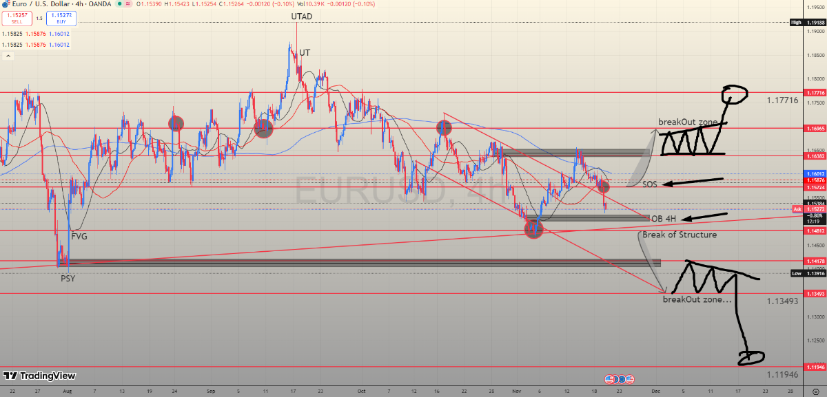 • Cenário de "breakOut zone...": Após a quebra de 1.1460, o gráfico projeta uma "breakOut zone..." abaixo, indicando que o preço continuará a cair, provavelmente em um movimento impulsivo de baixa.