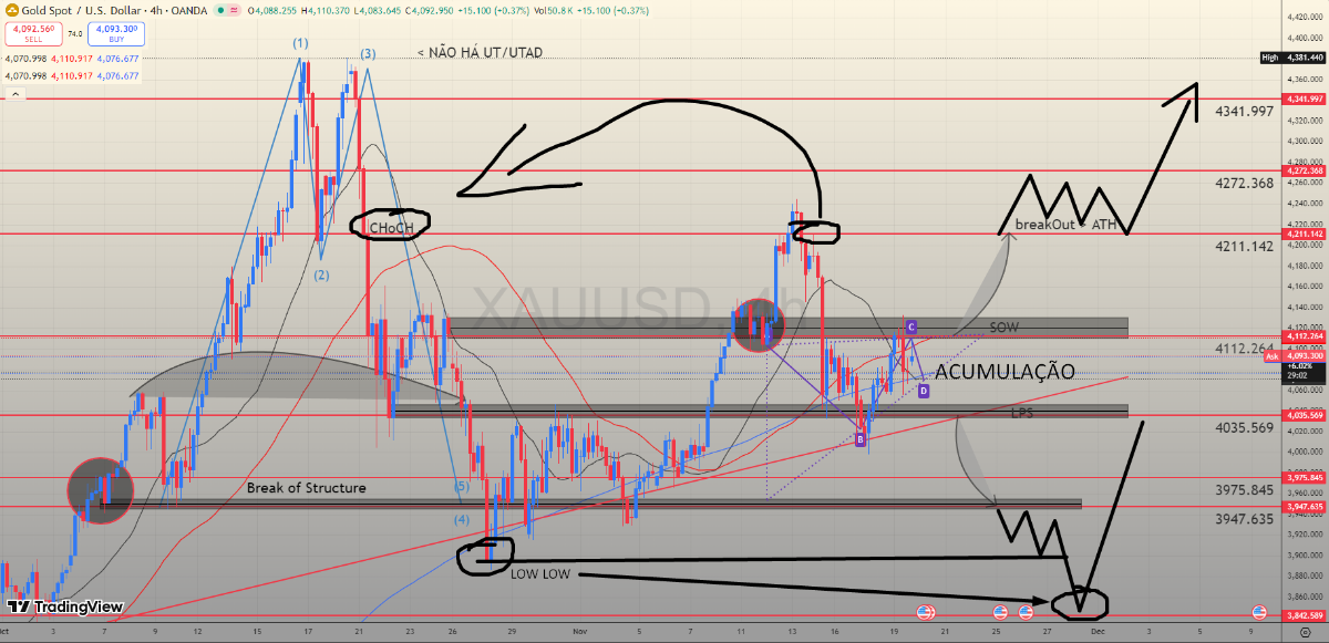 Vamos mergulhar em cada detalhe da estrutura Wyckoff presente no gráfico para entender onde estamos e para onde o ouro está se dirigindo.