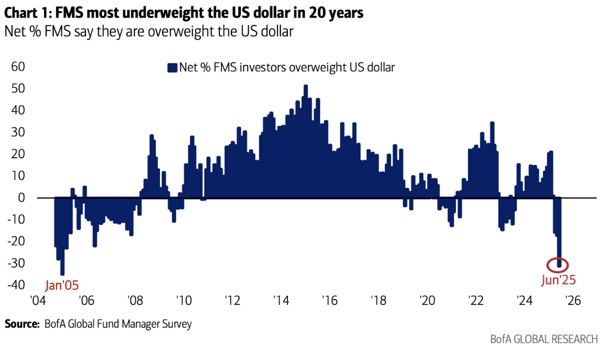 ANALISTA Igor Pereira Postado Junho 17 ANALISTA Denunciar Share Postado Junho 17 Investidores Estão com a Maior Posição Vendida em Dólar dos Últimos 20 Anos, Segundo BofA Segundo o último Fund Manager Survey do Bank of America, os gestores globais estão mais subalocados em dólar (USD) do que em qualquer outro momento nas últimas duas décadas. O movimento sinaliza uma mudança estrutural no apetite por risco cambial, impulsionada por: Rendimentos reais negativos frente à inflação; Diversificação de reservas por bancos centrais, com preferência crescente por ouro; Riscos geopolíticos crescentes envolvendo os EUA (conflitos com Irã e China); Percepção de sobrevalorização do dólar em relação a pares como euro, iene e yuan. Esse dado reforça a narrativa de desdolarização silenciosa e dá suporte ao movimento de alta do ouro (XAU/USD) observado nas últimas semanas. O Que Isso Indica? Pressão adicional sobre o DXY (Índice do Dólar), especialmente em caso de dados fracos nos EUA. Continuação do fluxo para ativos alternativos, como ouro, commodities e moedas emergentes. Redução na atratividade do dólar como reserva de valor global, fortalecendo o papel de ativos reais em contextos de incerteza. Comentário do Analista Igor Pereira "O mercado está antecipando a próxima perna da transição estrutural no sistema monetário global. A posição vendida histórica no dólar, somada ao crescimento agressivo das reservas em ouro por bancos centrais, mostra que o mundo está se reposicionando para uma era onde o dólar não será mais o único ativo de reserva dominante." Perfeito! Obrigado! Amei! Haha Confuso :/ Vixi! Wow! Gostei! × 💬 Gostou do conteúdo? Sua avaliação é muito importante! Gostei! Perfeito! Obrigado! Amei! Haha Confuso :/ Vixi! Wow! Citar Link para o comentário Compartilhar em outros sites More sharing options...