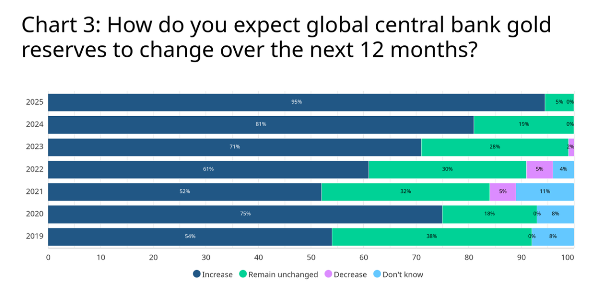 De acordo com o relatório, que ouve os gestores das reservas monetárias globais, 43% dos bancos centrais planejam aumentar suas próprias reservas de ouro nos próximos 12 meses. Este número representa um salto dramático em relação aos 21% registrados há apenas um ano, mostrando uma aceleração notável na tendência. Além disso, 95% das instituições esperam que as participações globais de ouro aumentem ou permaneçam estáveis, indicando um consenso esmagador sobre a relevância do ativo.