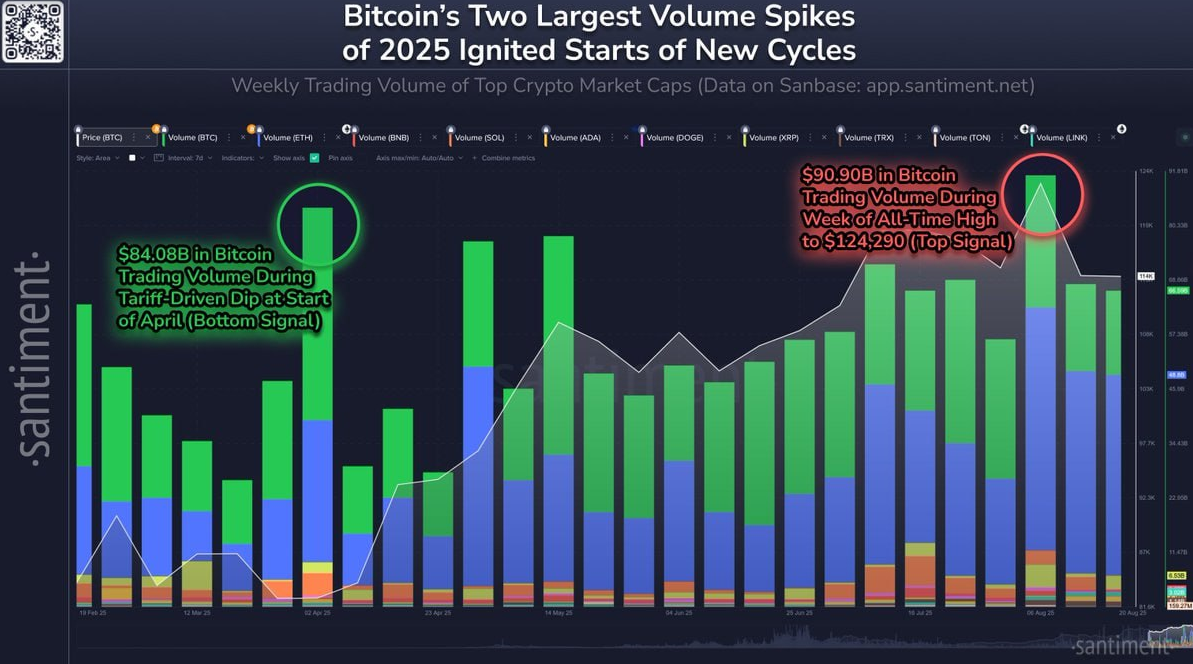 A renomada empresa de análise de criptoativos, Santiment, emitiu um alerta importante para os traders de Bitcoin. De acordo com seus dados, o volume semanal de negociação de BTC não apenas teve picos recentes, mas um deles quebrou o recorde histórico. Embora um volume alto possa parecer um sinal de força, a Santiment adverte: picos de volume dessa magnitude historicamente não marcam a continuação de uma tendência, mas sim grandes pontos de reversão.