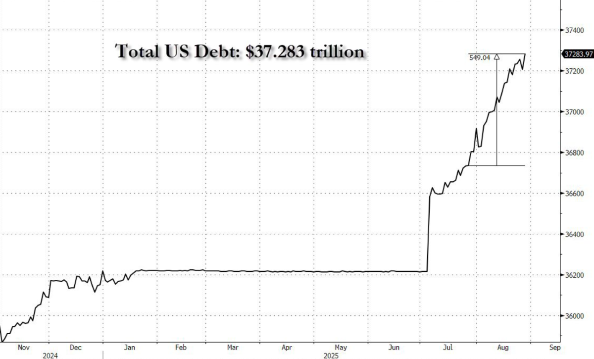 📊 A dívida total dos Estados Unidos atingiu US$ 37,283 trilhões, segundo dados oficiais do Tesouro americano. O mais alarmante é a velocidade desse avanço: somente no último mês, houve um acréscimo de aproximadamente US$ 550 bilhões, refletindo o crescimento acelerado do déficit fiscal e o aumento de emissões de Treasuries.
