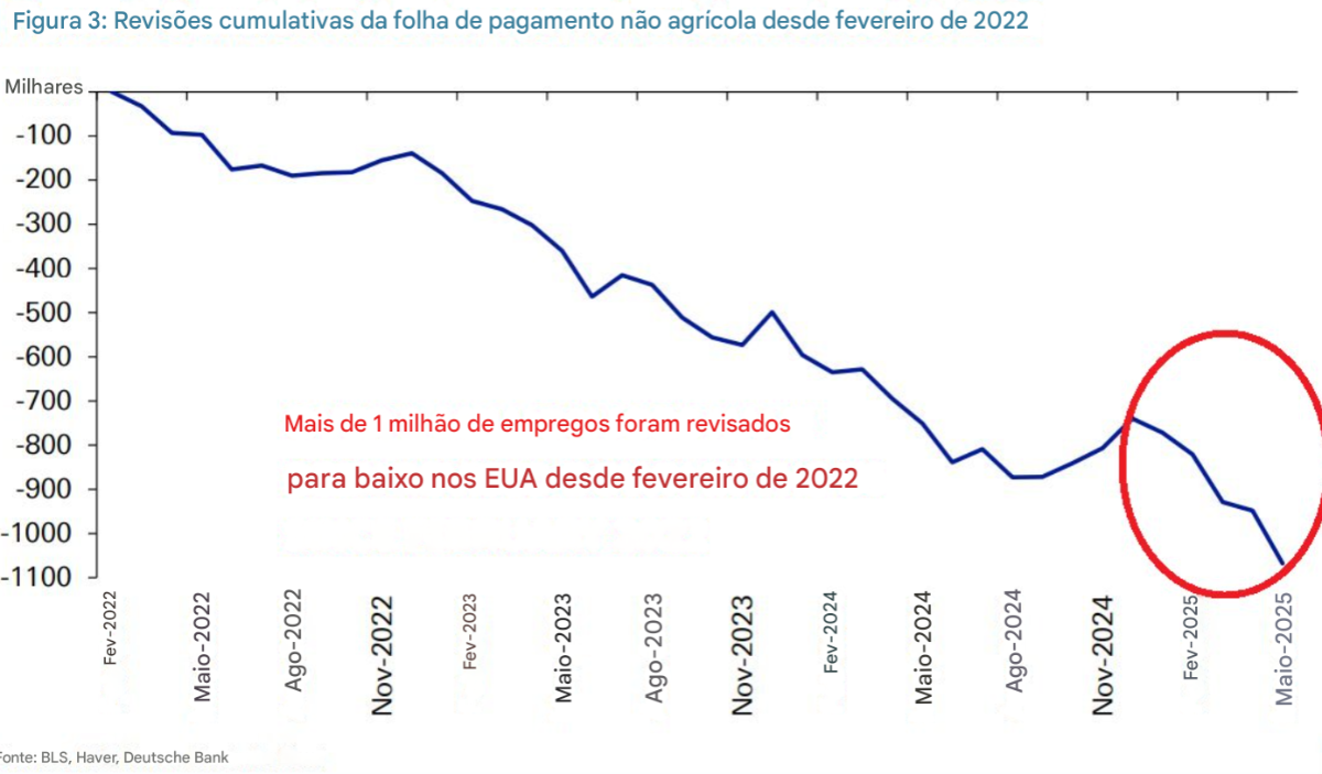• A Hemorragia Recente: Apenas nos meses de maio e junho de 2025, 280.000 empregos foram cortados dos números iniciais, a maior revisão negativa para um período de dois meses na história dos EUA.