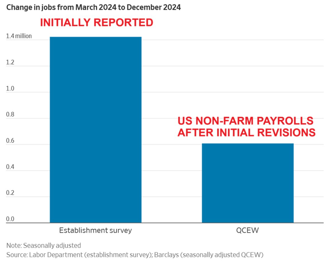 A "revisão de referência", por outro lado, é a eleição em si. Uma vez por ano, o BLS confronta os dados da pesquisa com os registros concretos do Censo Trimestral de Emprego e Salários (QCEW). O QCEW não é uma pesquisa; é um censo que cobre 95% de todos os empregos nos EUA através dos registros obrigatórios de seguro-desemprego. É o dado real. Quando a "pesquisa" e a "eleição" divergem massivamente, a realidade se impõe.